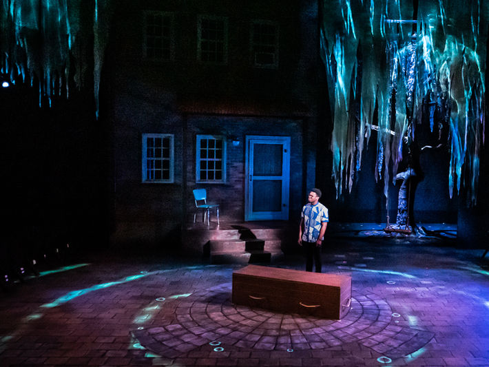 I had the pleasure of designing both the Scenic and Media elements for this performance. The story seamlessly shifts between a grounded Louisiana neighborhood and dream spaces filled with spiritual energy, so in the design we focused on making transitions smooth and blurring the boundaries between these worlds. Through the use of UV paint embedded in the set and precisely mapped projection, powerful visual shifts immersed the audience in the world of the story.